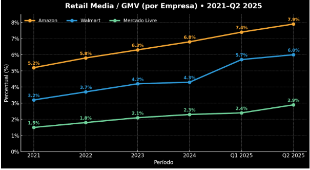 Para uma análise justa, é fundamental usar a métrica certa. Aqui, o foco é na receita de Retail Media como percentual do GMV, ou seja, a proporção do volume total de vendas que se transforma em receita publicitária.
